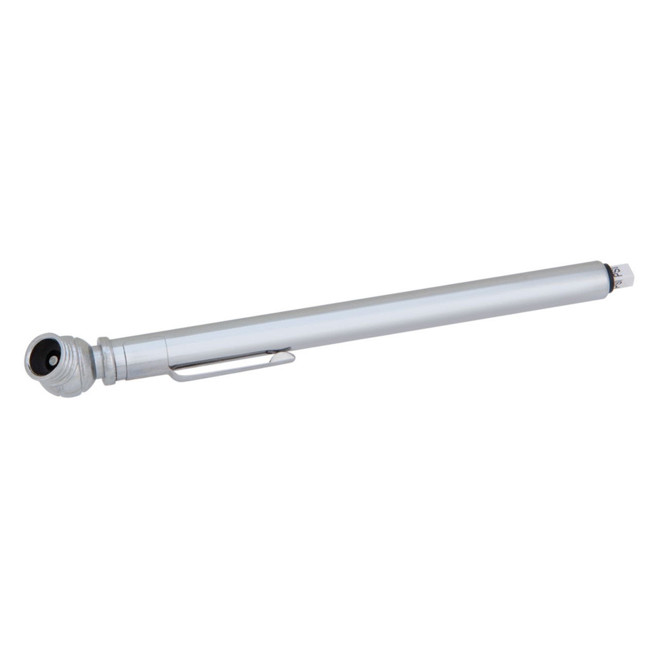 Pencil-type tire pressure gauge with a range of 10 to 50 PSI. Features a handy pocket clip.