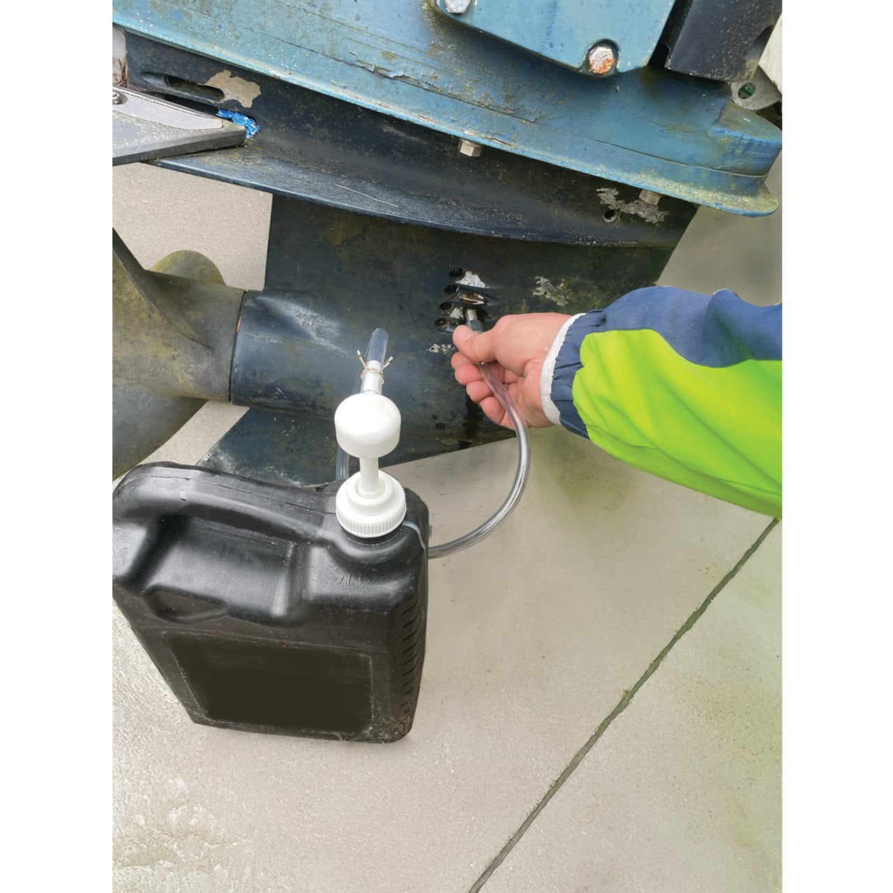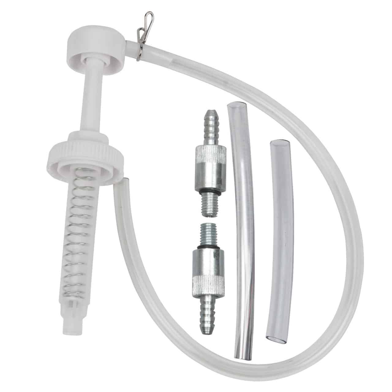 Lower Unit Fluid Pump with a double-threaded cap that fits a variety of marine lower units. Includes a 24 inch flexible hose.