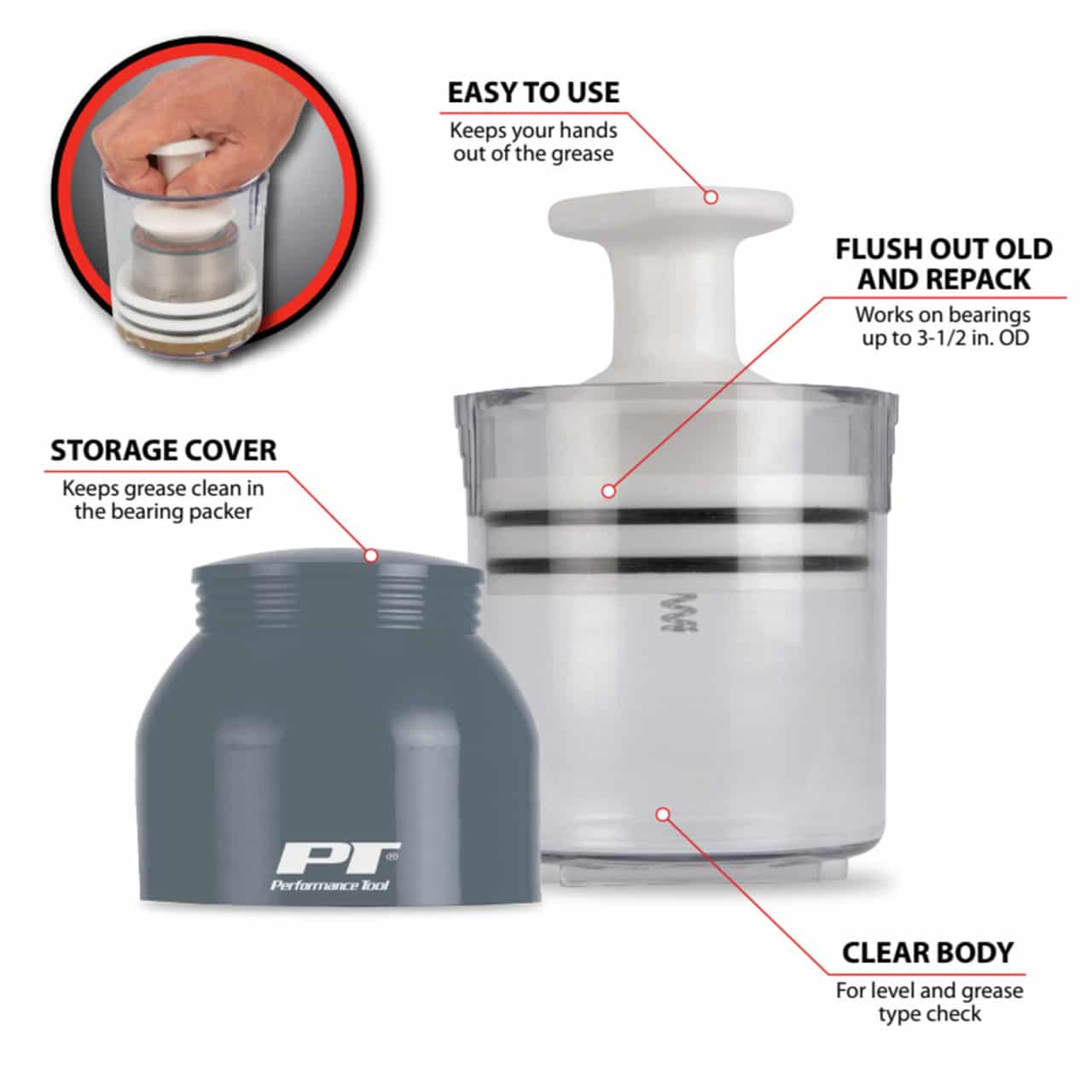 Use to flush out old and repack bearings with fresh grease up to 3.5 inches OD